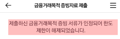 "증빙 서류가 인정되어 한도제한이 해제되었습니다."라고 알려주네요.
