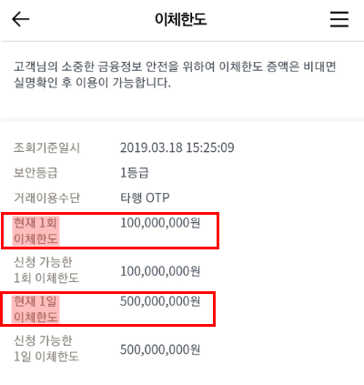 만약 보안등급이 1등급이라면 이체한도를 1회 1억원, 1일 5억원까지 설정할 수 있습니다.