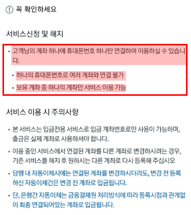 만약 연결 계좌를 변경하려면 서비스 해지 후 새로 신청해야 합니다.