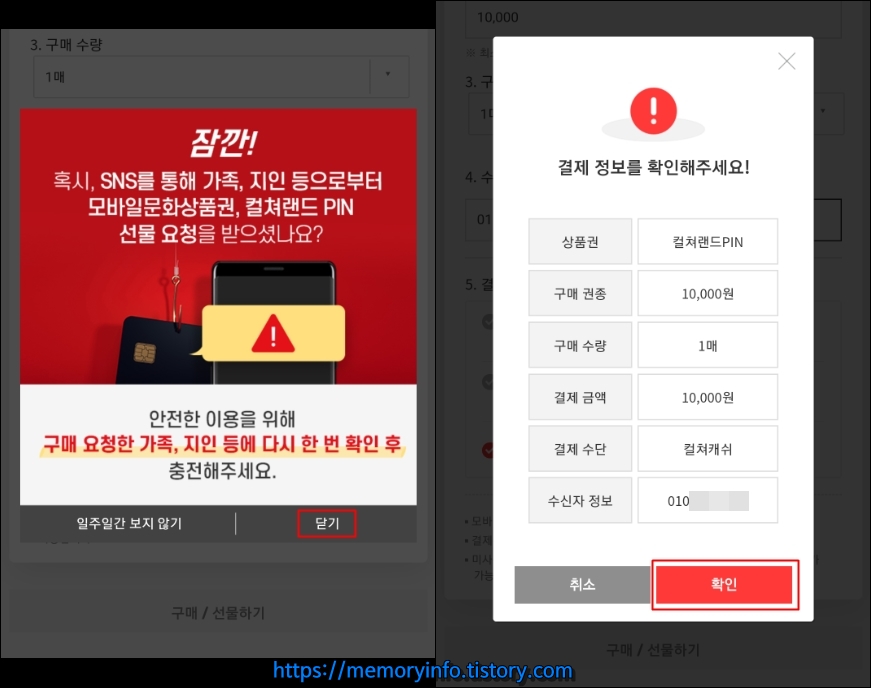 취소 버튼을 누르면 위와 같이 '구매하신 컬쳐랜드 PIN을 취소하시겠습니까?'라는 창이 뜬다.