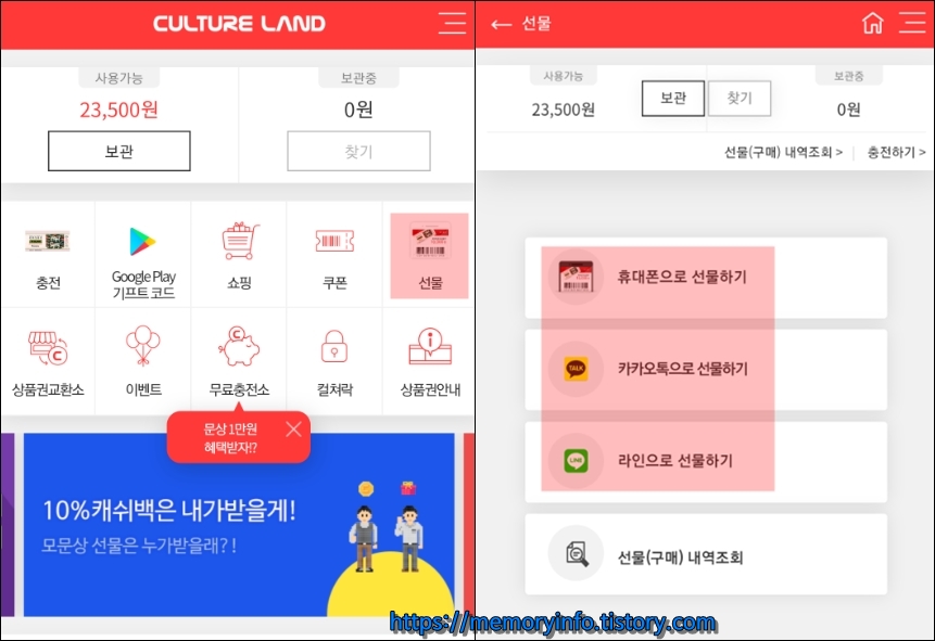 컬쳐랜드 캐시 선물은 모바일에서 가능하며,
