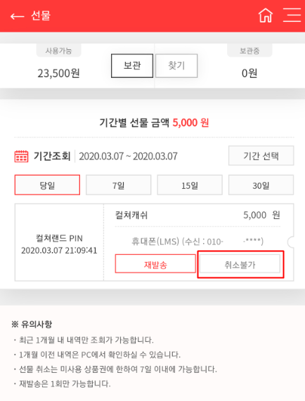 그리고 핀번호를 재발송(1회만 가능)하거나 선물을 취소하는 것도 가능하다.
