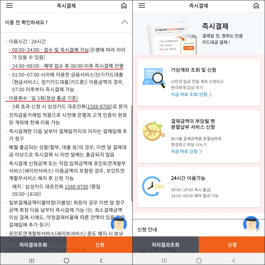 삼성카드 즉시결제 서비스는 24시간 이용 가능합니다.