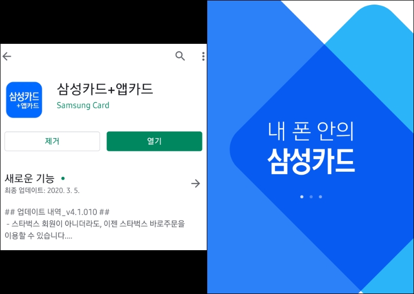 먼저 '삼성카드+앱카드' 앱을 설치하고 실행시켜줍니다.