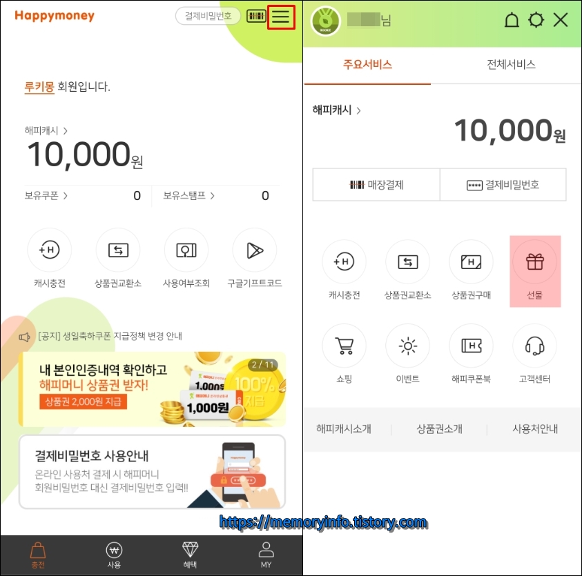 그리고 해피머니는 상대방에게 내가 보유한 해피머니 잔액을 선물하는 것도 가능하다.