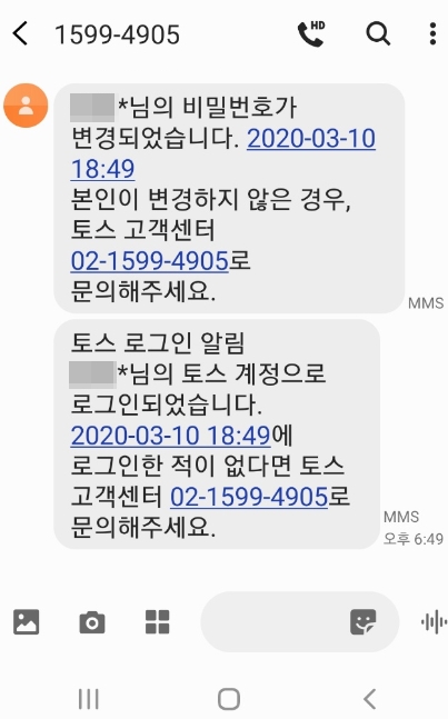 토스 비밀번호가 변경되었다고 문자로도 알려주는군요.