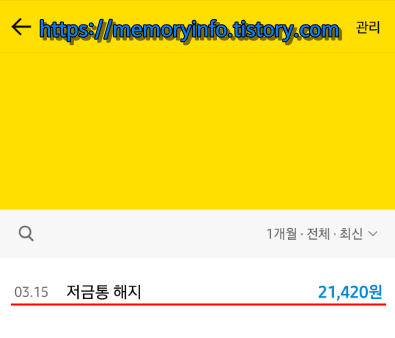 저금통 해지로 21,420원(원금+이자)이 입금되었네요.