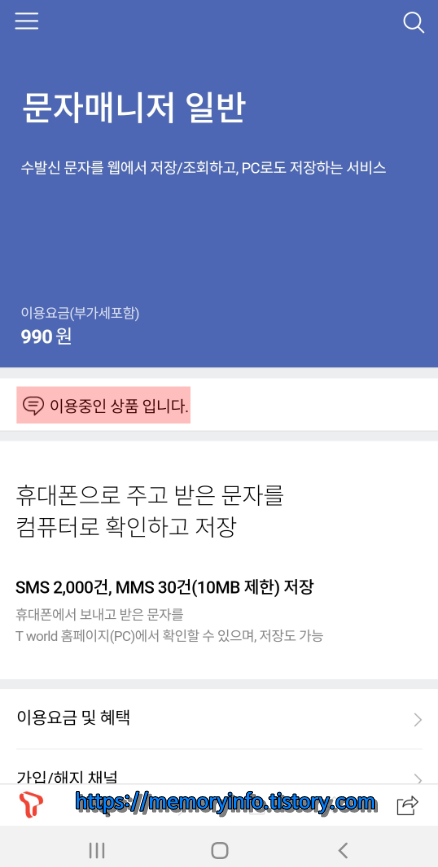 가입을 완료하니 문자매니저 일반 상품이 '이용중인 상품입니다.'로 상태가 바뀌었네요.