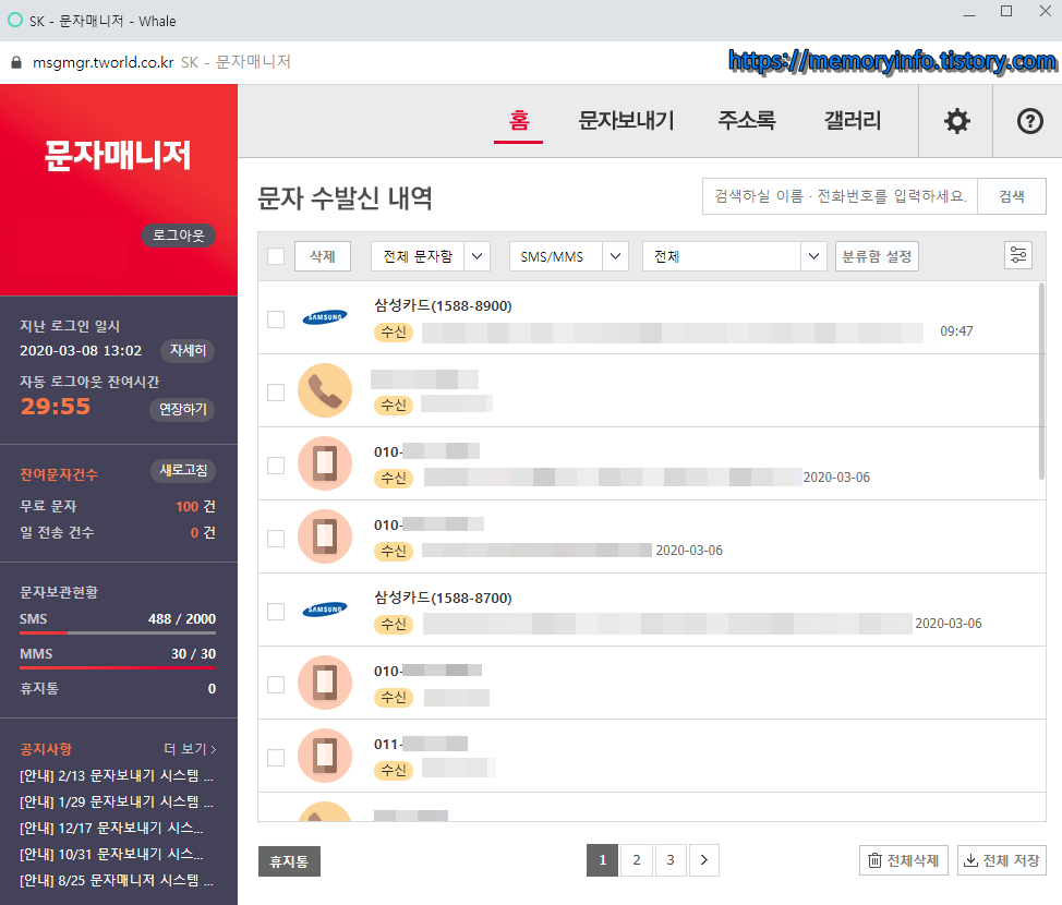 티월드 홈페이지 로그인 > 문자보내기 > '문자매니저'로 들어가면 서비스를 이용할 수 있습니다.