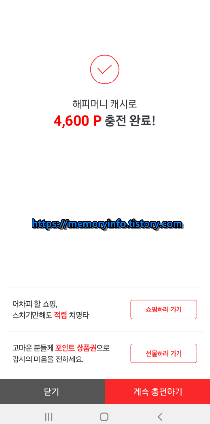 이렇게 해피머니 캐시를 이용한 페이코 포인트 충전을 완료했다.
