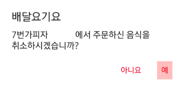 위와 같이 '주문하식 음식을 취소하시겠습니까?'라는 팝업 창이 뜰텐데