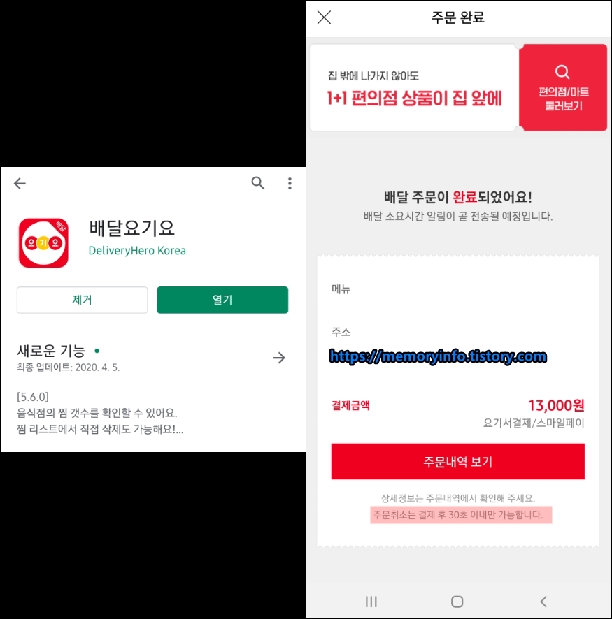 요기요는 30초 안에 주문 취소 버튼을 눌러야 가능하다.