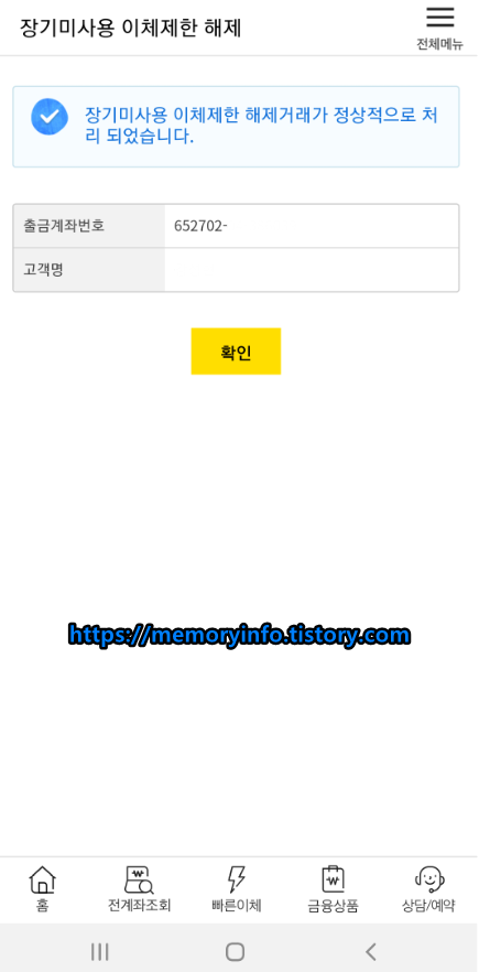 국민은행 장기미사용 이체제한 해제방법