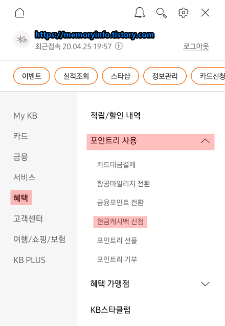 혜택 > 포인트리 사용 > '현금캐시백 신청'을 눌러준다.