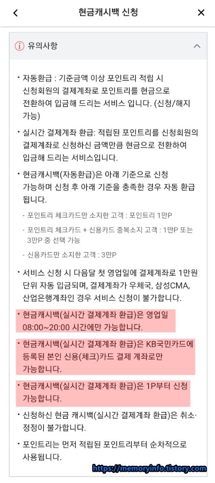 그리고 또 현금 캐시백은 신용 및 체크카드 결제 계좌로만 받을 수 있으며,