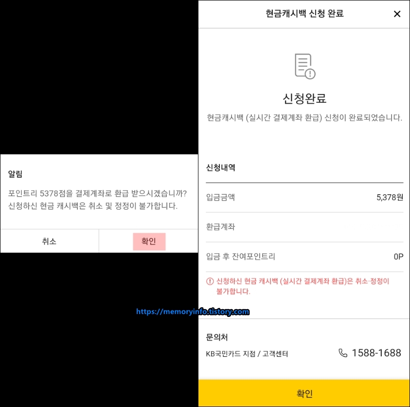 신청 버튼을 누르면 위와 같이 포인트 환급 신청 확인 창이 뜨는데