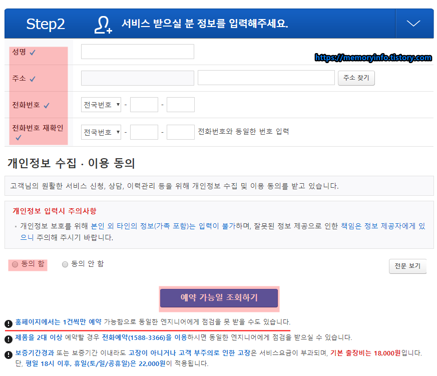 우측에 '출장서비스 예약 진행'을 눌러 서비스 예약을 계속 진행했다.