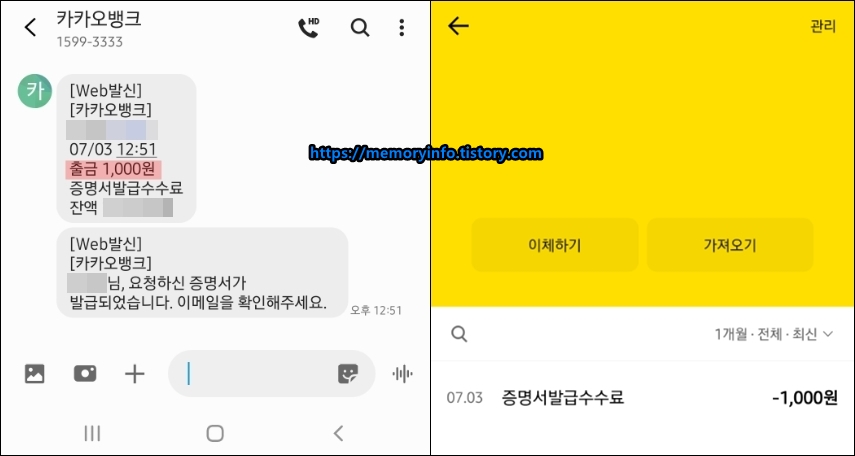 발급 수수료는 1,000원이며, 현재 보유하고 있는 카카오뱅크 계좌로만 납부할 수 있다.