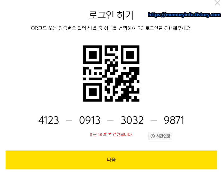 QR코드 로그인 또는 인증번호 로그인 중 본인에게 편한 로그인 방법을 선택해준다. 참고로 나는 인증번호 로그인으로 진행했다. 현재 PC 화면에 나오고 있는 인증번호 16자리를 그대로 여기에 입력해주면 된다.