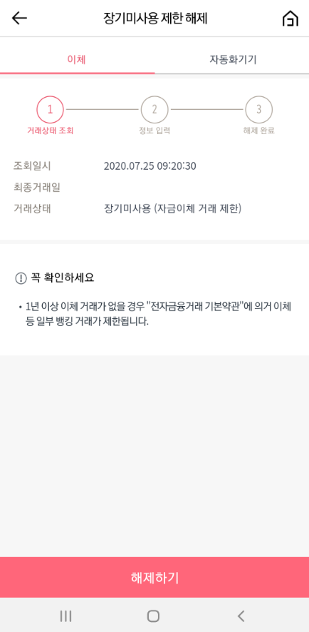 메인 화면에서 이체 버튼을 누르면 '제한 상태 해제 후 이용바랍니다.'라는 메시지가 뜨는데. 여기서 해제하기 버튼을 눌러준다.