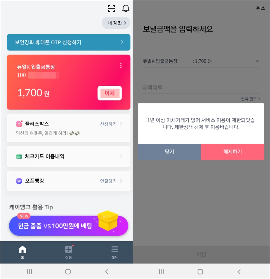 케이뱅크 장기 미사용 이체 제한 해제방법