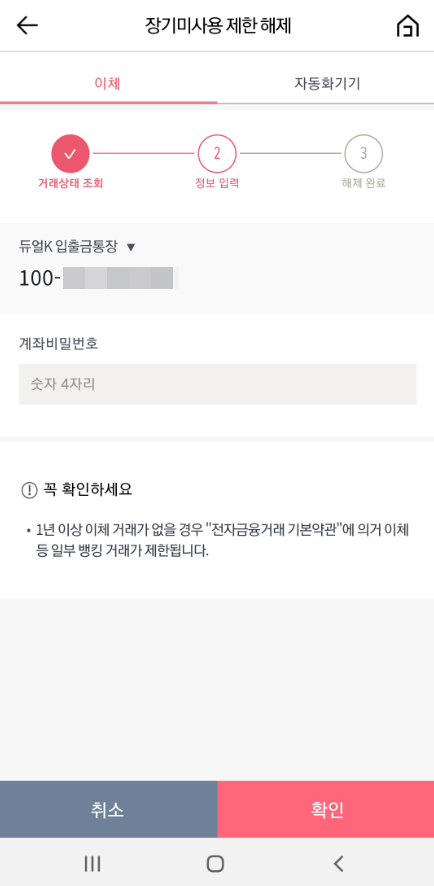 이로써 장기 미사용 이체 제한 해제가 완료되었다. 이제 이체하기를 문제없이 할 수 있을 것이다.