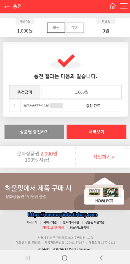 문자로 받은 핀번호를 입력해 문화상품권 충전을 완료한 모습이에요.