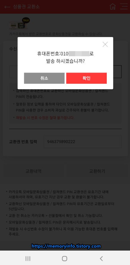 수신자 정보에 휴대폰 번호를 입력하고, 교환권 번호에는 카카오톡 선물함에서 볼 수 있는 바코드 밑에 핀번호 숫자 12자리를 입력해줍니다.