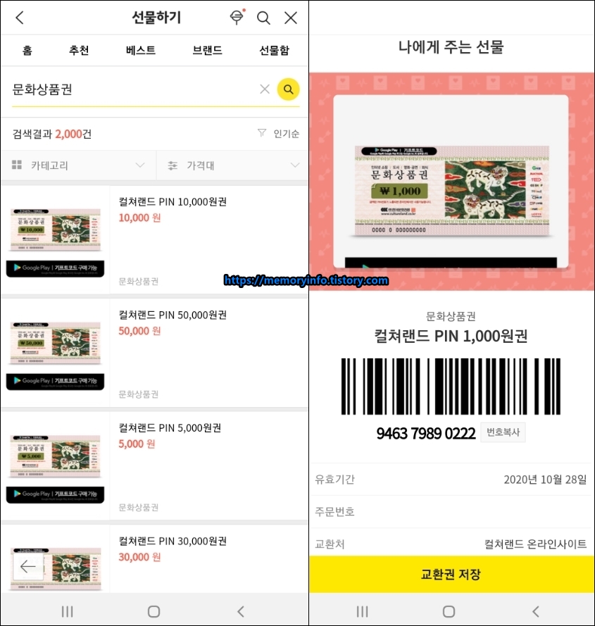 카카오톡 선물하기를 통해 받은 컬쳐랜드 문화상품권을 사용하려면 컬쳐랜드의 상품권 교환소(PC, 모바일 앱)를 통해 충전 가능한 핀번호로 바꿔줘야 합니다.