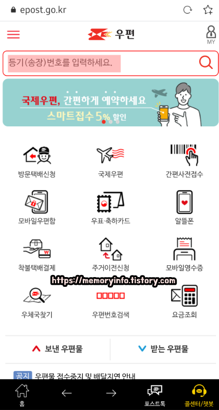 인터넷 우체국 홈페이지 접속 후, 상단에 '등기(송장)번호'를 입력하고 검색 버튼(돋보기 모양)을 눌러줍니다.