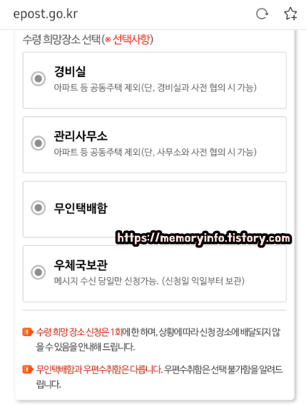 참고로 수령 희망 장소 신청은 1회만 가능하며, 무인 택배함과 우편 수취함은 다른 것입니다. (우편 수취함은 선택이 아예 불가능)