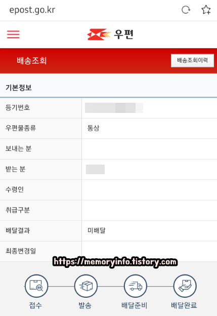 그러면 이렇게 해당 송장의 배송 조회가 되는데요. 여기서 배달 결과를 한 번 살펴보면 '미배달'이라고 적혀있는 것을 알 수 있습니다.