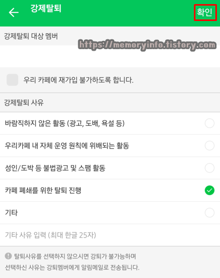 강제탈퇴 사유를 '카페 폐쇄를 위한 탈퇴 진행'으로 선택한 후, 우측 상단에 보이는 '확인'을 눌러줍니다.