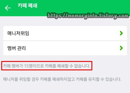 만약 해당 카페에 나를 제외한 다른 멤버들이 있는 상태라면 다른 멤버들을 모두 강제 탈퇴 처리한 후에야 폐쇄 신청을 할 수 있습니다.