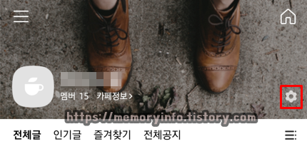 폐쇄할 카페 접속 후, 우측 상단에 보이는 톱니바퀴 모양(설정)을 눌러줍니다.
