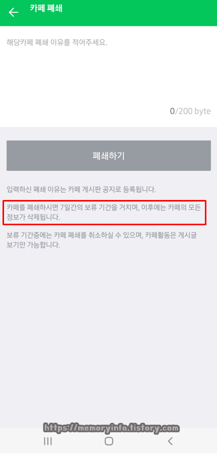 카페 폐쇄 이유를 적은 후, 폐쇄하기를 눌러줍니다.