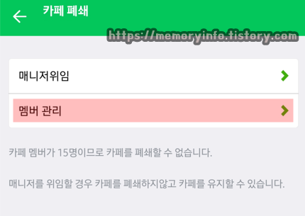 카페 멤버들을 모두 강퇴(강제 탈퇴) 시켜주기 위해 '멤버 관리'를 눌러줍니다.