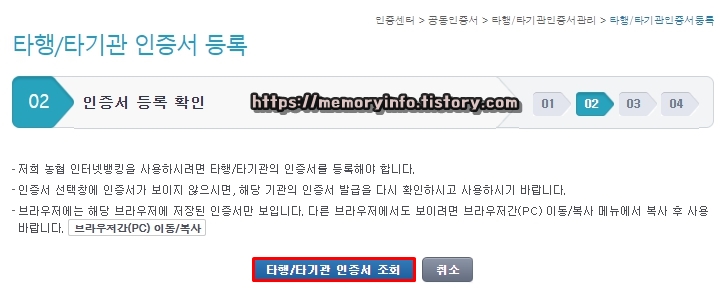 아래에 보이는 '타행/타기관 인증서 조회'를 눌러줍니다.