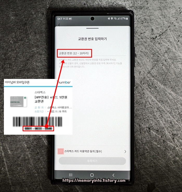 스타벅스 e카드 교환권 바코드 아래에 있는 '숫자로 구성된 교환권 번호'를 입력해줍니다. 이후, 약관 동의 후 아래에 보이는 '등록하기'를 눌러줍니다.