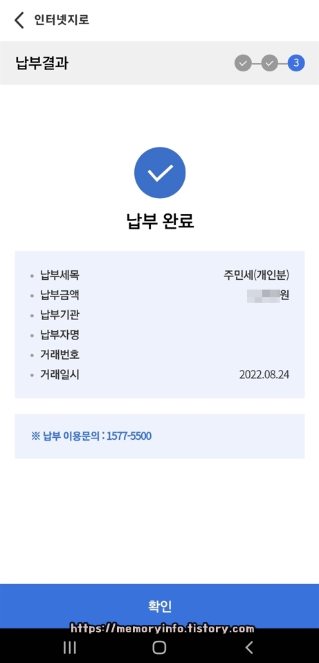 납부 정보에 이상이 없다면, 위와 같이 이렇게 '납부 완료'라고 뜰 것입니다. 납부 완료라고 표시된다면, 주민세 납부가 완료된 것입니다.