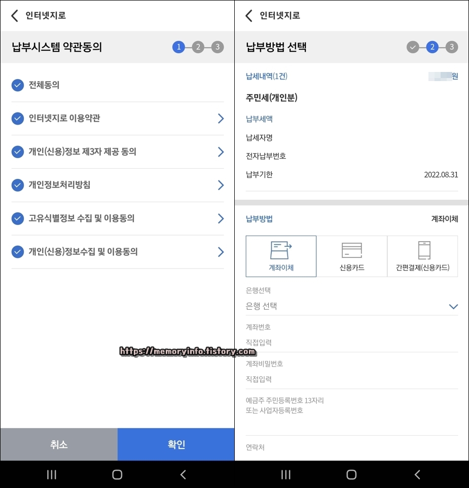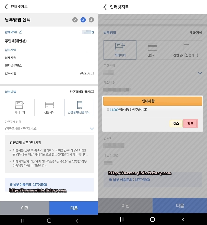 납부 방법 선택 및 정보를 입력했다면, 아래에 보이는 '다음'을 눌러줍니다. 그리고 이어서 납부 확인 창이 뜨면 '확인'을 눌러줍니다.