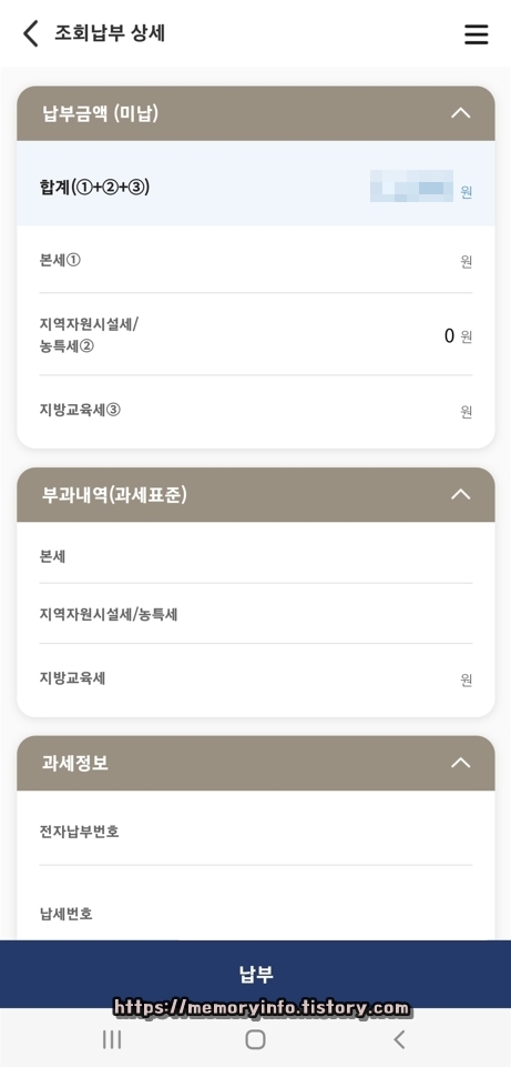 세금 부과 내역을 확인한 후, 아래에 보이는 납부 버튼을 눌러줍니다.