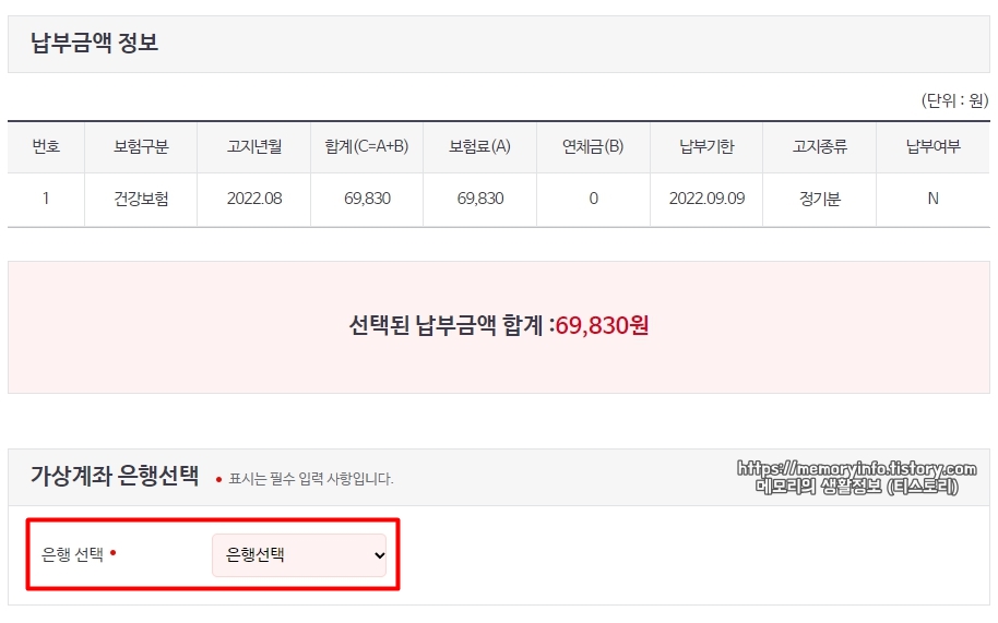 그러면 건강보험료 납부 신청이 완료되는데요. 신청 완료 후, 납부보험료 정보에 적힌 계좌로 납부기한 내에 돈을 보내면 보험료 납부가 바로 처리될 것입니다.