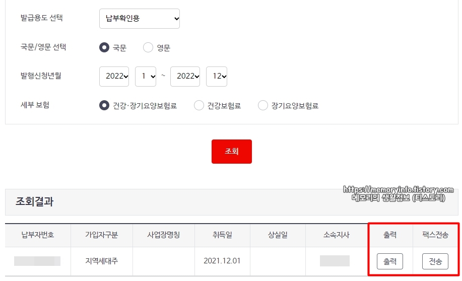 조회 결과에 나오는 출력 또는 전송 버튼을 통해 프린터 인쇄, PDF파일 저장, 팩스 전송이 가능합니다.