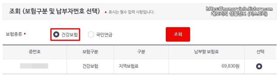 보험 종류를 건강보험으로 체크한 후, 우측에 보이는 조회 버튼을 눌러줍니다.