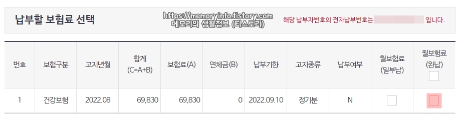 이어서 납부할 보험료를 선택해줍니다. 참고로 보험료는 일부납 또는 완납이 가능한데요. 원하시는 납부 방향을 체크해주면 됩니다. 저는 이번에 완납을 한 번 해보겠습니다.
