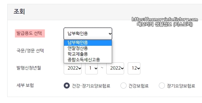 건강보험료 납부확인서 발급 용도로는 납부확인용, 연말정산용, 학교제출용, 종합소득세 신고용이 있습니다.