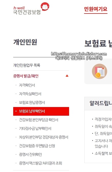 ※ 보험료 납부 확인서 메뉴 경로는 "국민건강보험 홈페이지 > 민원여기요 > 개인민원 > 증명서 발급/확인"입니다.