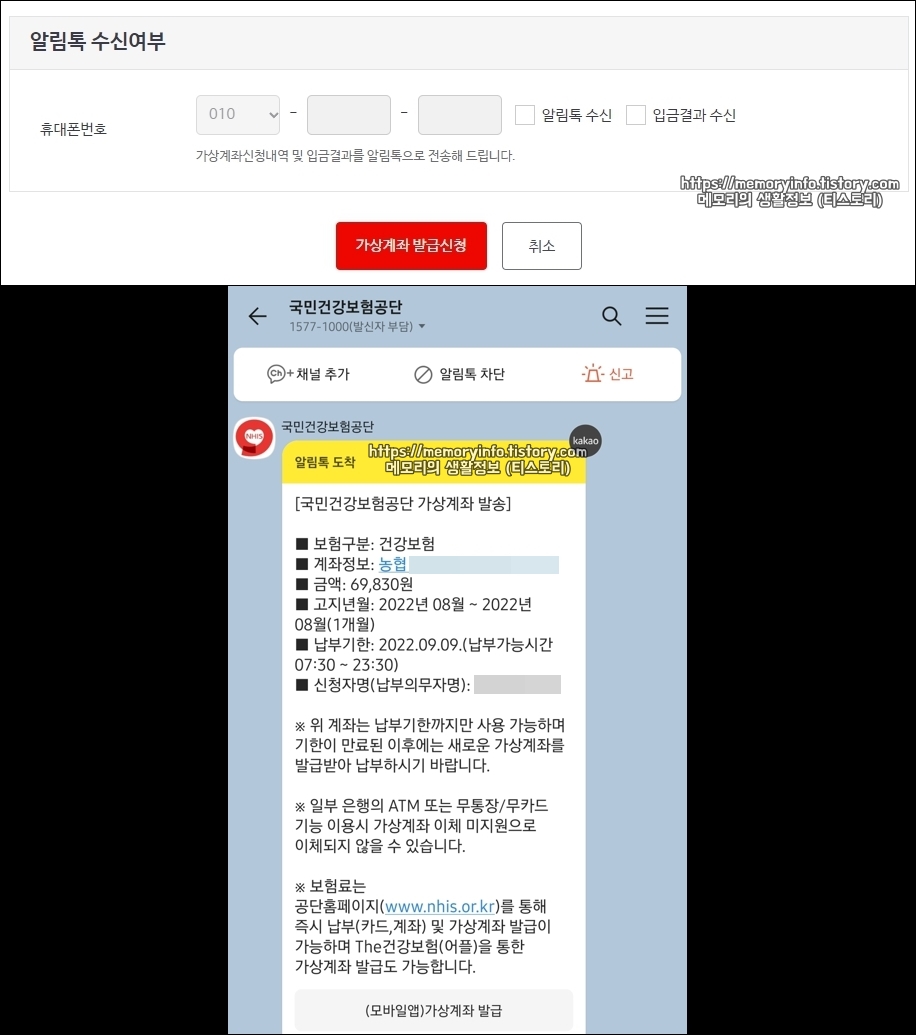 이어서 알림톡 수신 여부를 입력해줍니다. 알림톡 수신을 체크하면 이렇게 납부 정보를 카카오톡 알림톡으로 받아볼 수 있습니다. 모두 입력했다면, 아래에 보이는 '가상계좌 발급신청'을 눌러줍니다.