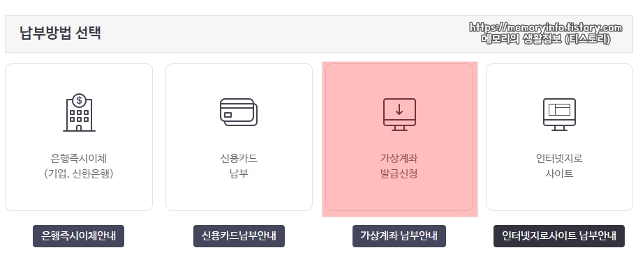 납부 방법을 선택해줍니다. 저는 납부 대행 수수료가 없는 "가상계좌 납부"를 선택했습니다.